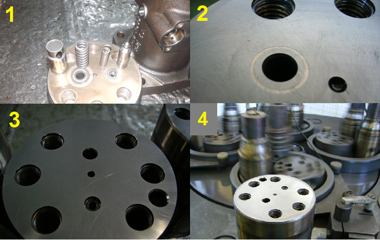 1-. Asiento superior de una camisa de elemento con sus válvulas de un motor ROLLS ROYCE BERGEN. 2-. El mismo asiento tras horas de lapeado, la marca pertenece al asiento de la válvula de impulsión. 3-. El mismo asiento reacondicionado sin marca alguna de la válvula. 4-. Máquina de lapeado trabajando las camisas de elementos y las piezas de conexión (porta-válvulas).