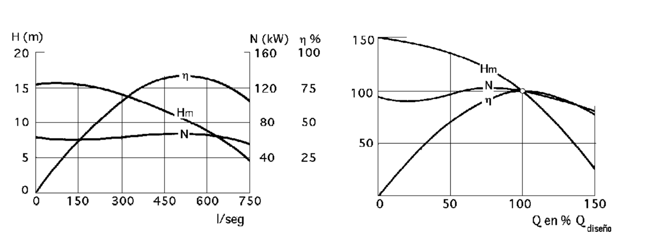 Figura 3.7.: Curvas características de una bomba semiaxial (izquierda) y curvas semejantes (derecha).